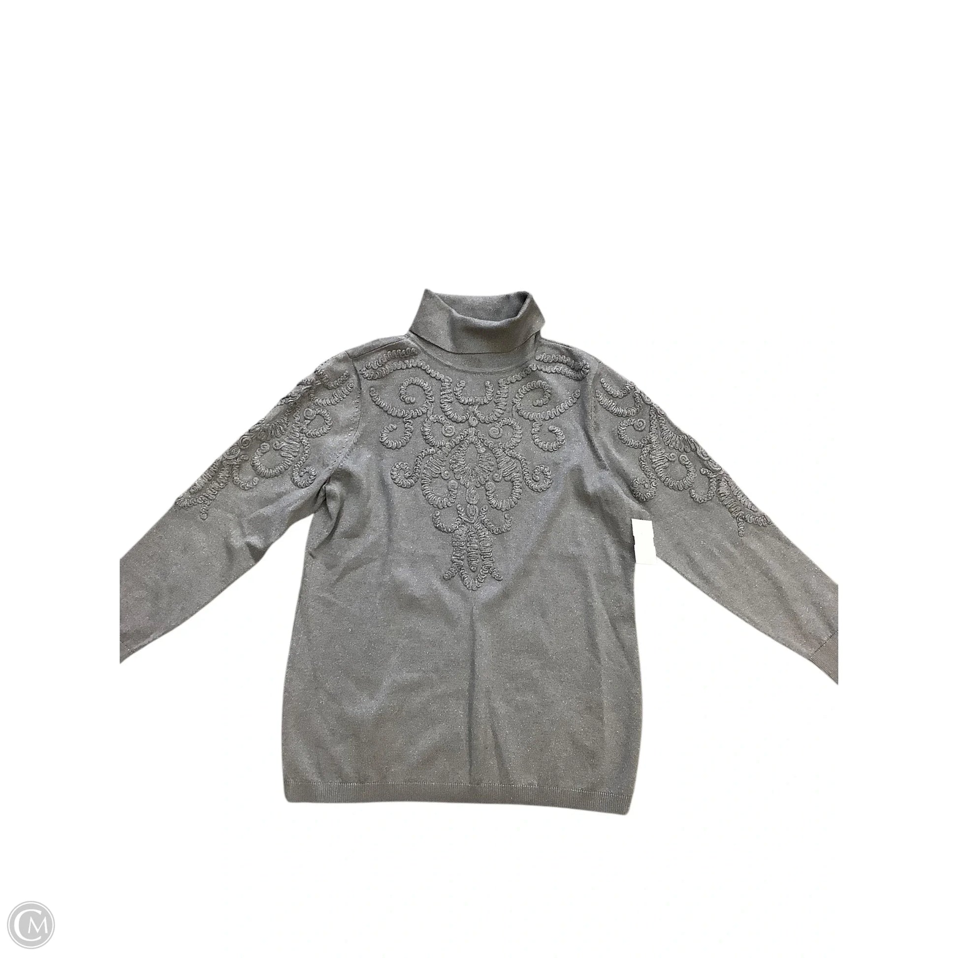 Chico's grey sweater in Medium: Luxurious fabric, perfect fit, timeless elegance.
